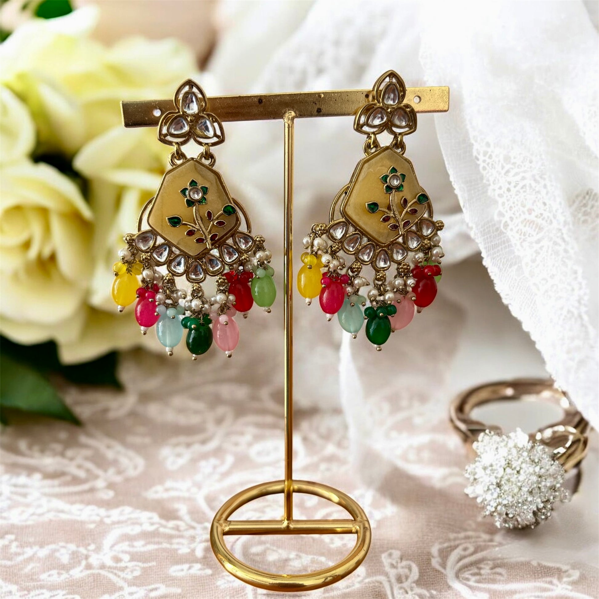 Celebrate elegance and vibrant tradition with our Phoolon Ki Baaraat Earrings — a delightful fusion of colorful beads, pearl accents, and hand-painted floral motifs. Adorned with kundan-style stones and multicolored droplets, these earrings are a joyful statement piece perfect for festive gatherings, weddings, and cultural celebrations.