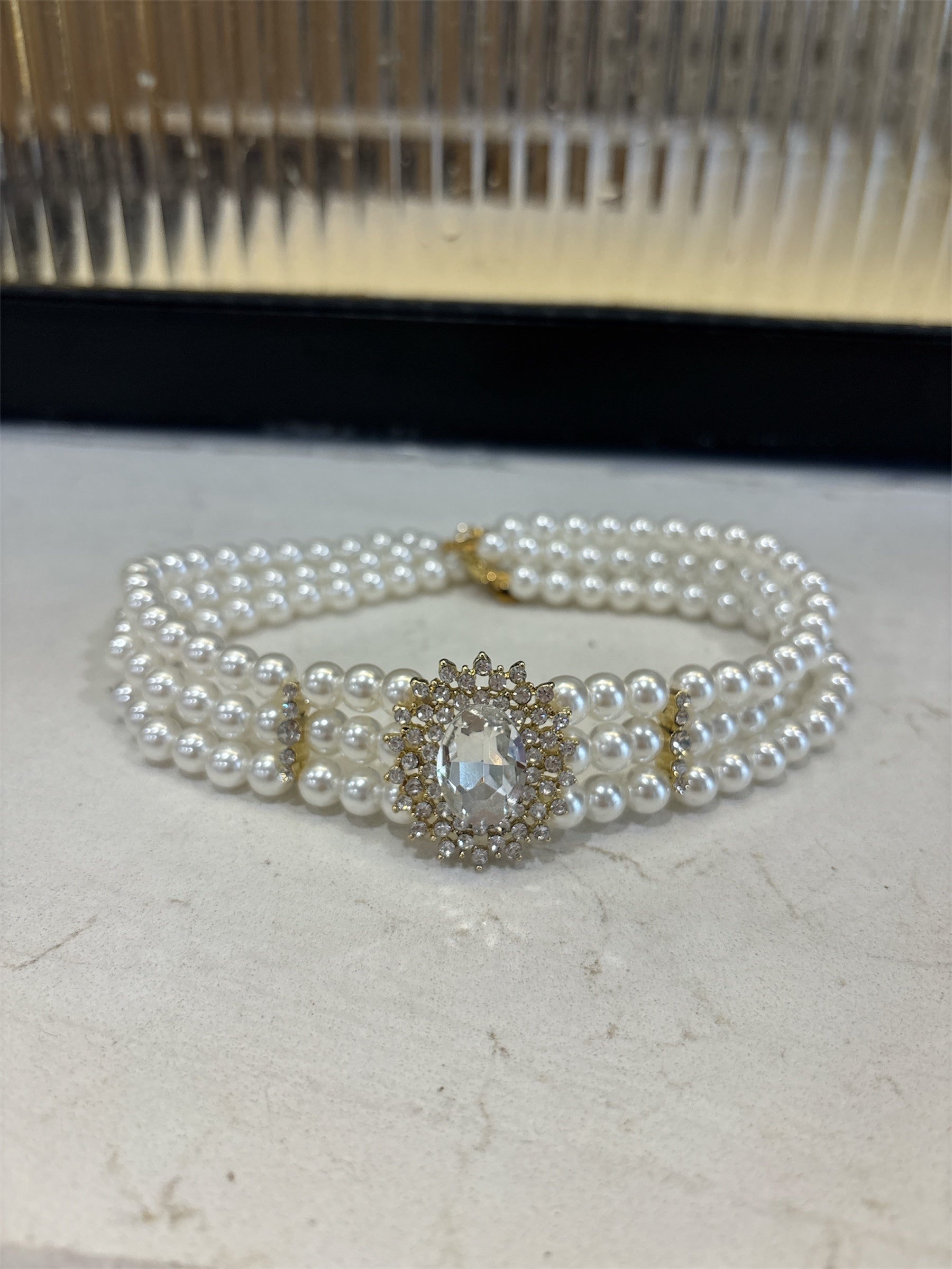 Exude timeless elegance with the Royal Grace Pearl Choker, a statement piece designed to elevate every look. Featuring three luxurious strands of luminous faux pearls, this necklace is adorned with a radiant crystal-studded centerpiece that sparkles with every movement.