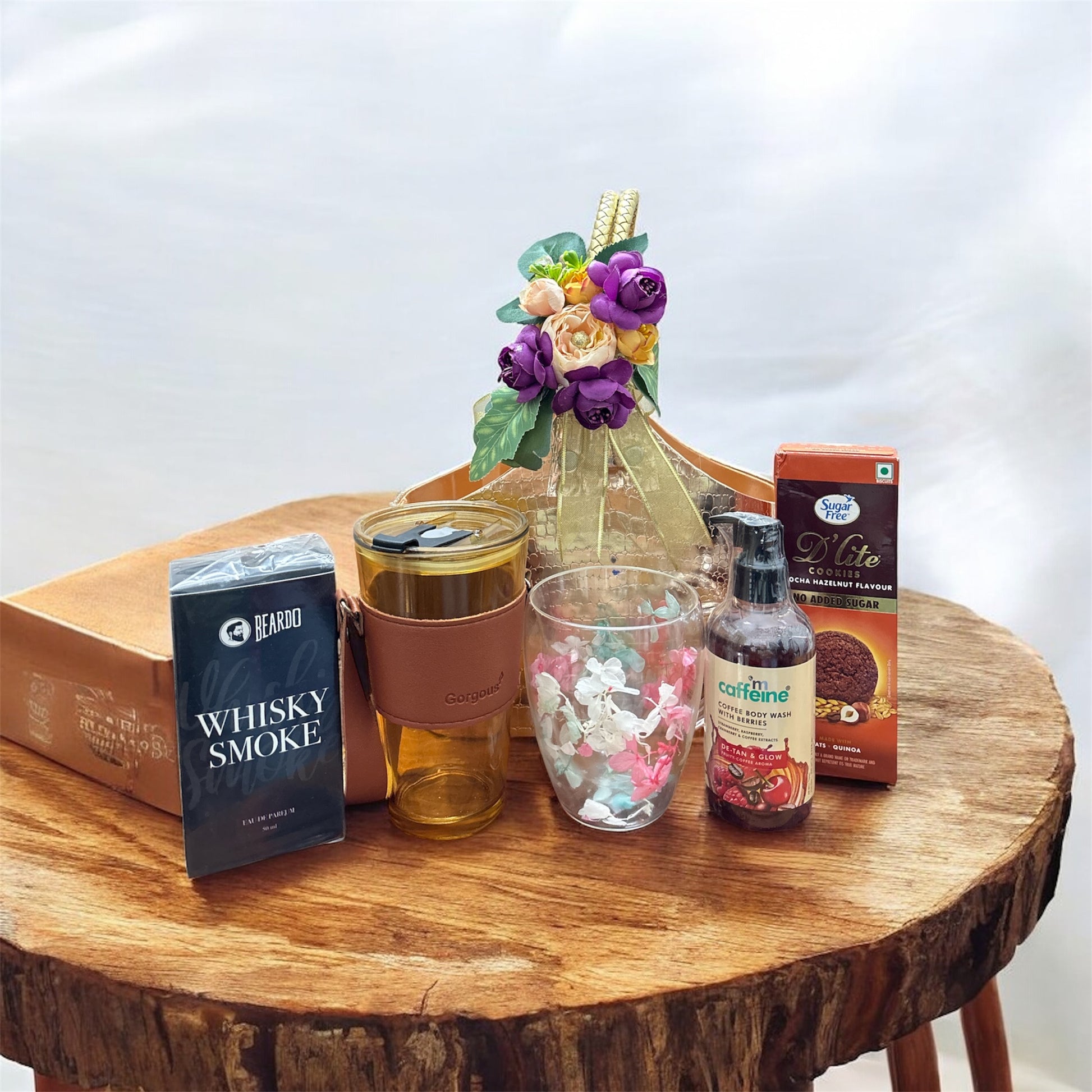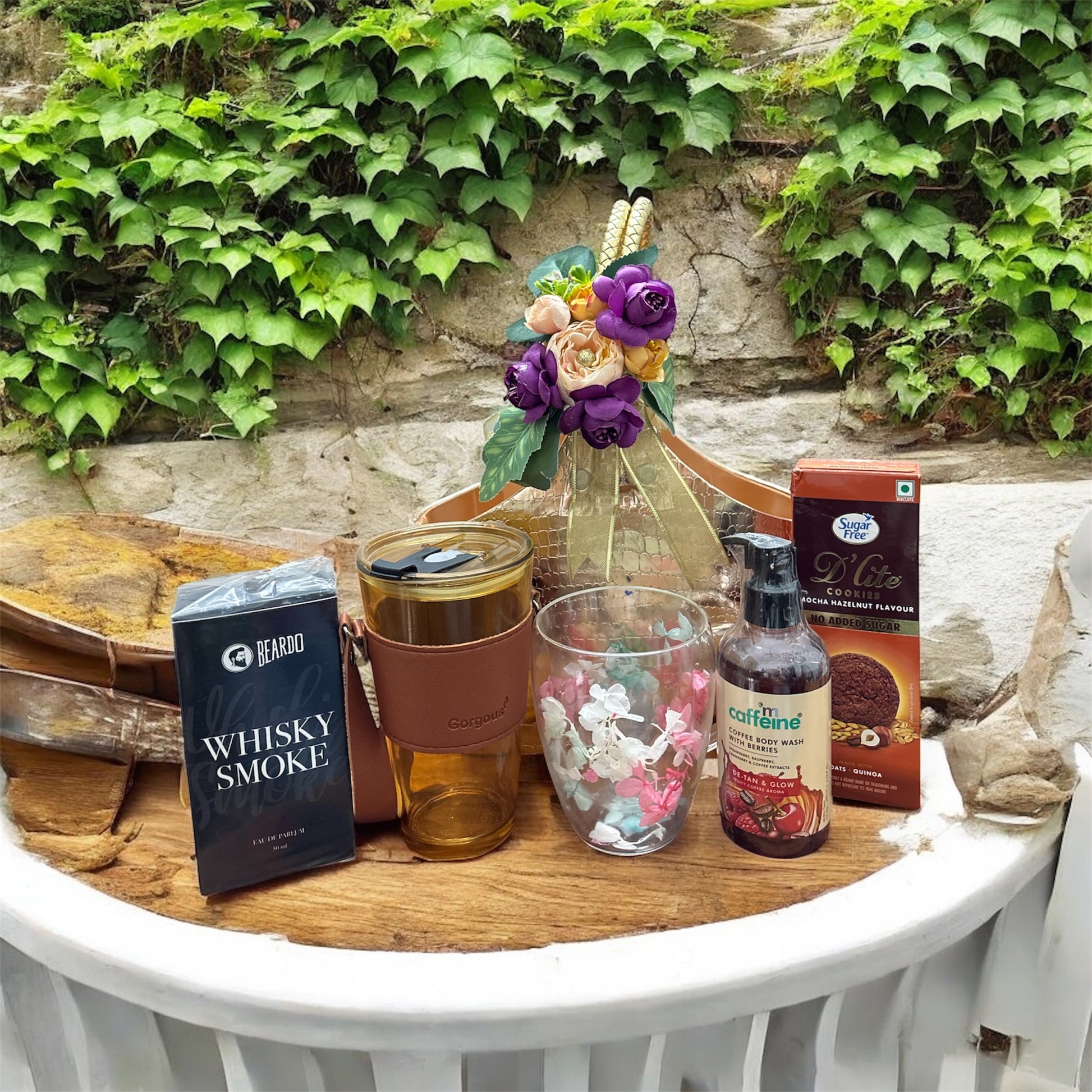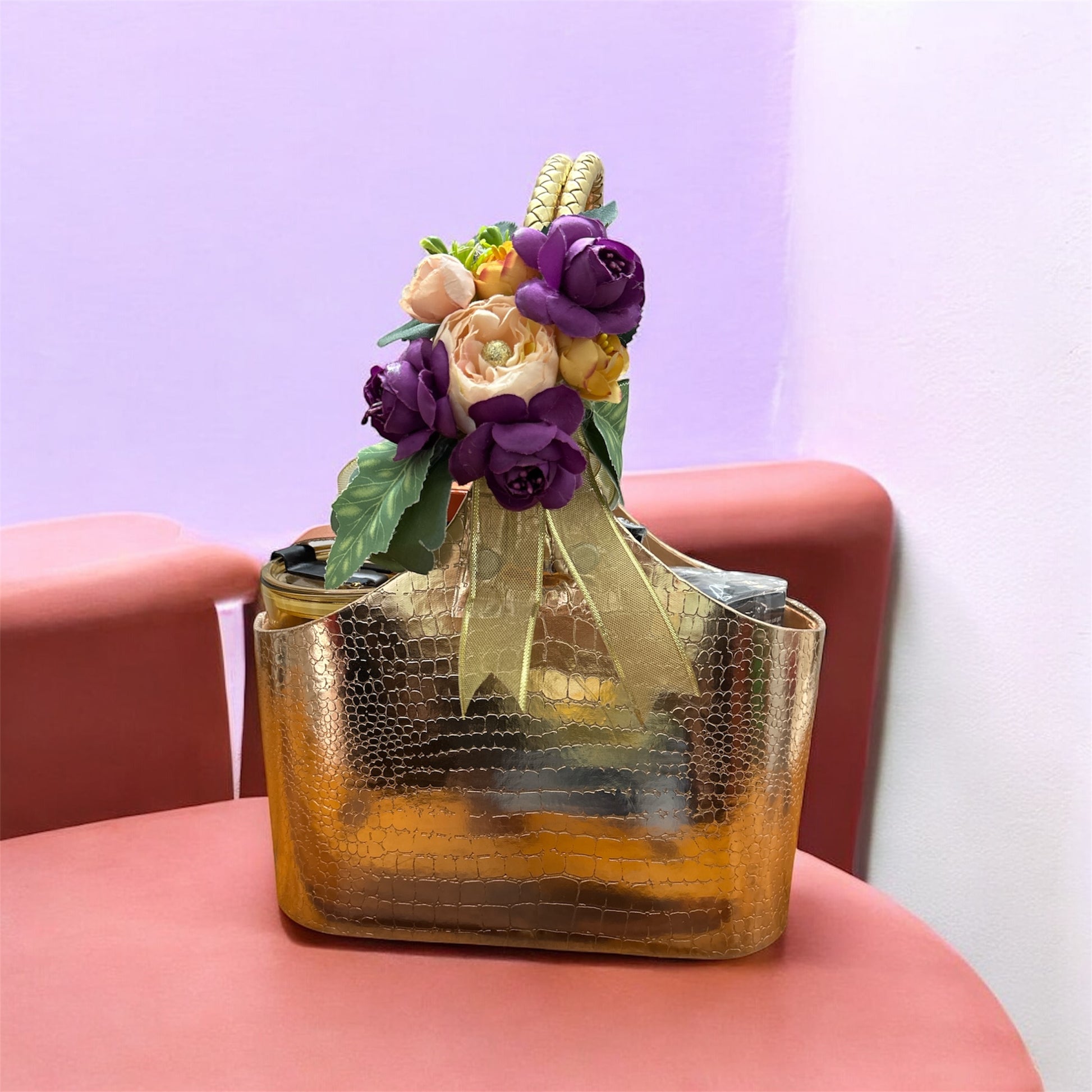 Golden Luxe Basket with Floral Topper – Beautifully wrapped and ready to gift, making the unboxing as joyful as the contents.