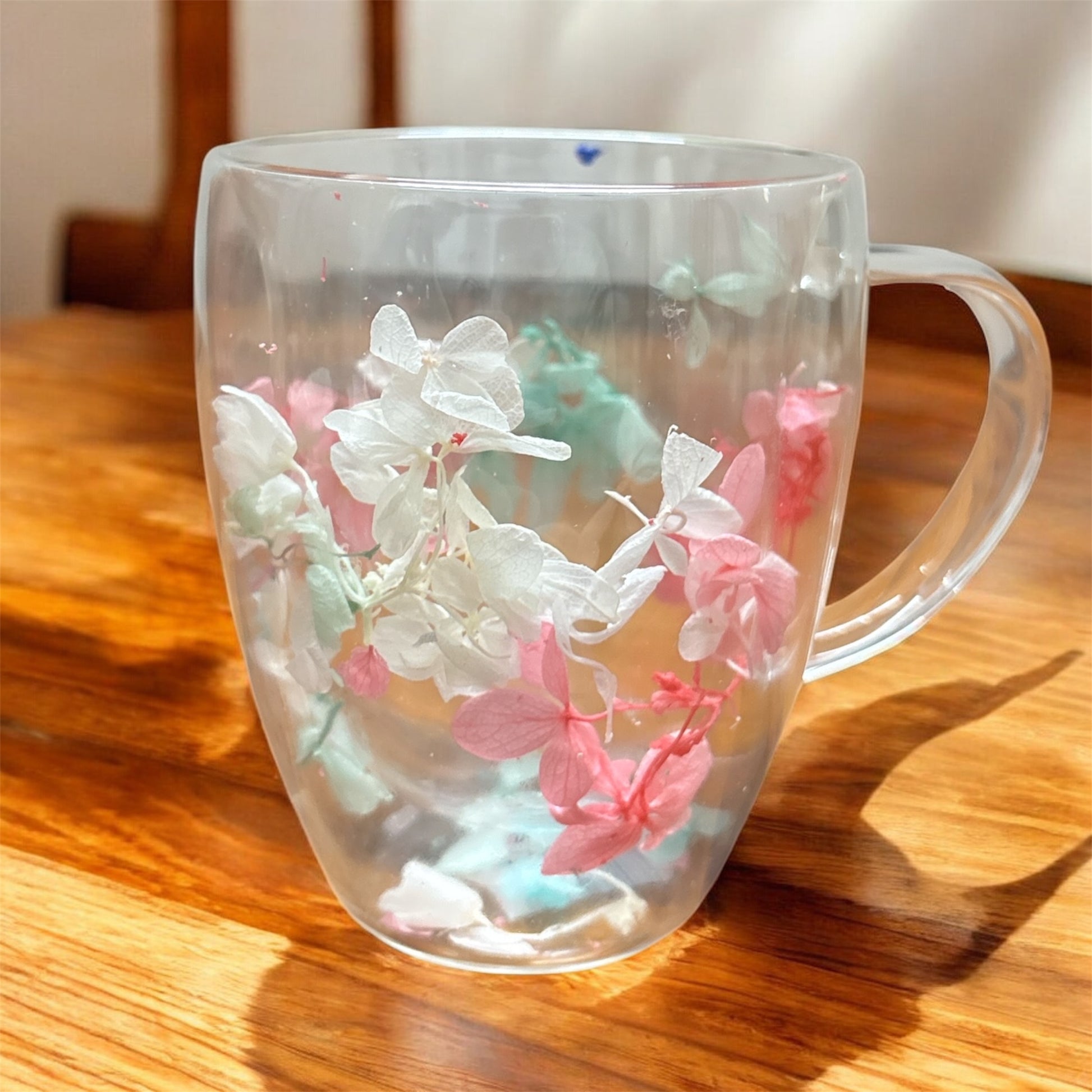 Dried Flowers Double Wall Glass Mug (White & Pink) – A beautifully crafted clear glass mug with delicate dried flowers encased between double walls. With its elegant handle and insulation, it's perfect for enjoying hot cocoa or iced lattes — a charming keepsake for cozy shared moments.